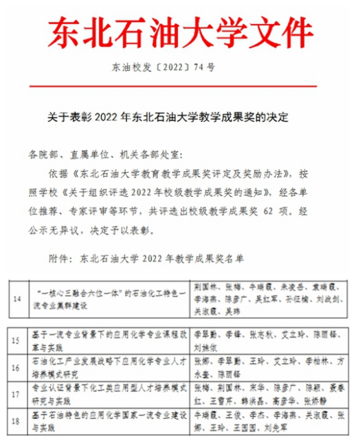 近日,东北石油大学2022年校级教学成果奖揭晓,共评选出校级教学成果奖62项,我院荆国林、李翠勤、张娜、张梅和牛瑞霞等5位老师负责的成果获奖。